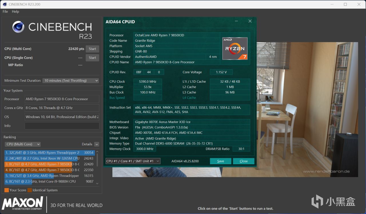 CINBENCH R23多核循環項目十分鐘後,9850X3D分數爲22420 pts