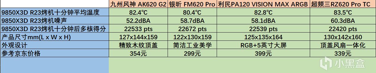 綜合以上來看,單看散熱性能的話,銀昕FM620 Pro溫度最低,並且它體積最小,價格也是最爲實惠,很適合追求極致性價比的玩家。九州風神AK620 G2木紋頂蓋設計很特別,風扇配置高還支持扣具偏移,散熱性能也不錯,滿載噪聲和其他產品能拉開明顯差距,價格適中。