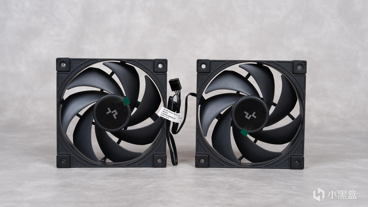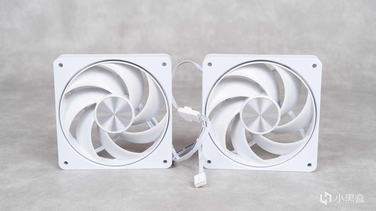 標配的兩枚風扇均爲120mm規格,配備星環雙層CD紋路,內部採用長壽耐用、低故障率的雙滾珠軸承,最大風扇轉速可達到2400±10%,最高可提供4.0mmH2O風壓和80CFM風量,也是自帶公母接頭設計。