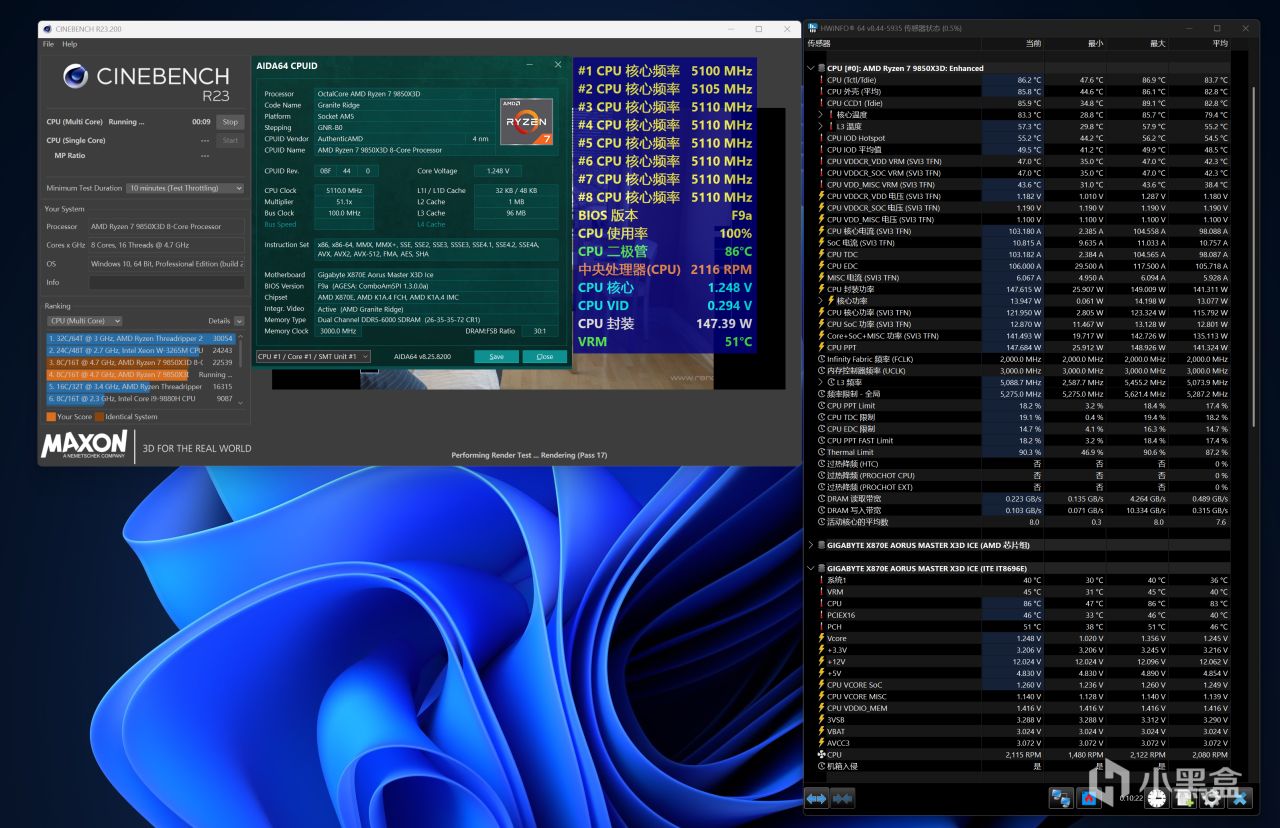CINBENCH R23多核循環項目十分鐘後,9850X3D分數爲22533 pts
