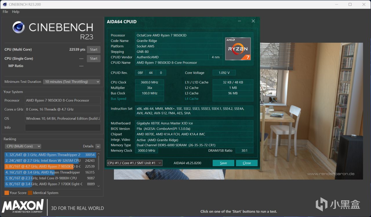CINBENCH R23多核循環項目十分鐘後,9850X3D分數爲22539 pts