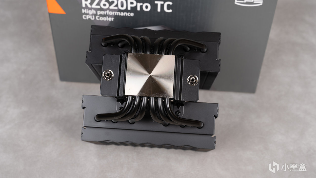 超頻三RZ620 Pro TC採用全黑化處理,鰭片採用家族化元素設計——三角幾何交錯矩陣,基於氣動聲學原理,可有效降低高頻部分的雜音,從而提供更好的使用體驗,解熱功耗方面官方並未提供任何數據。