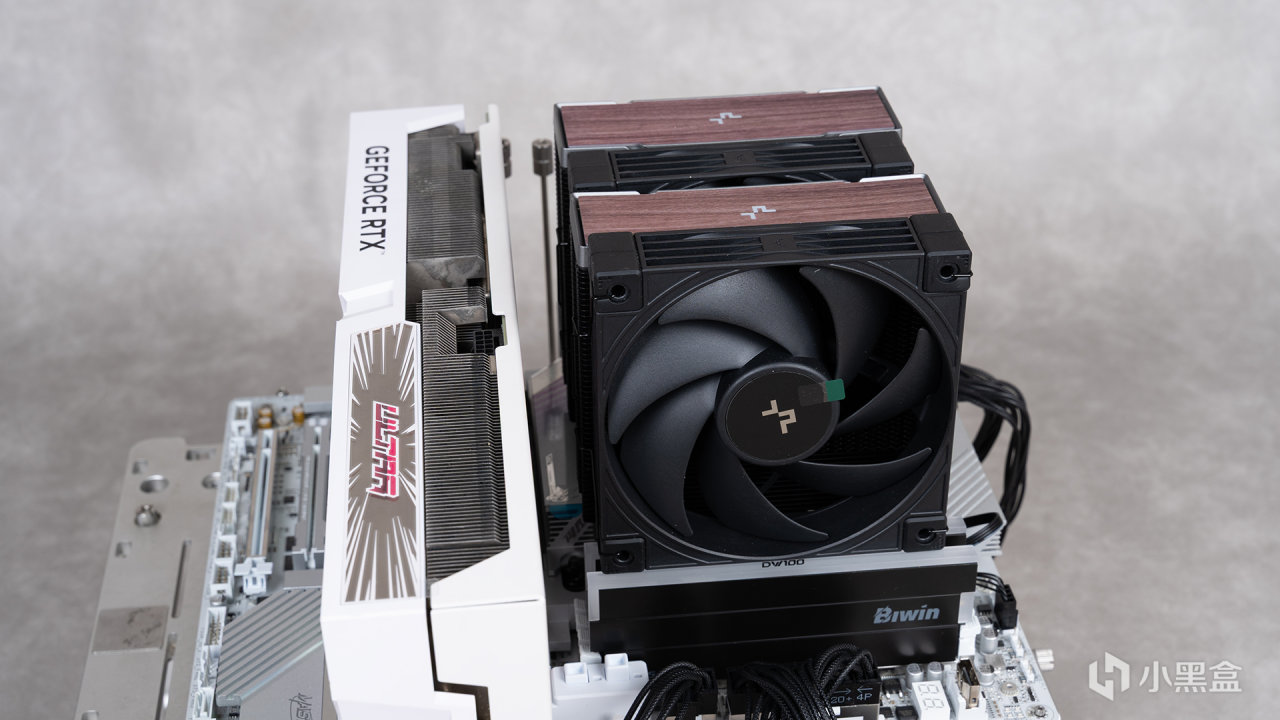 九州風神AK620 G2暗夜牽制風扇同樣需要抬高一點點,木紋頂蓋確實質感特別,只要電腦不是長時間不通電運行,就無需木材發黴問題,偏移扣具只需要扣上散熱器之前做調整就行,方便得很。