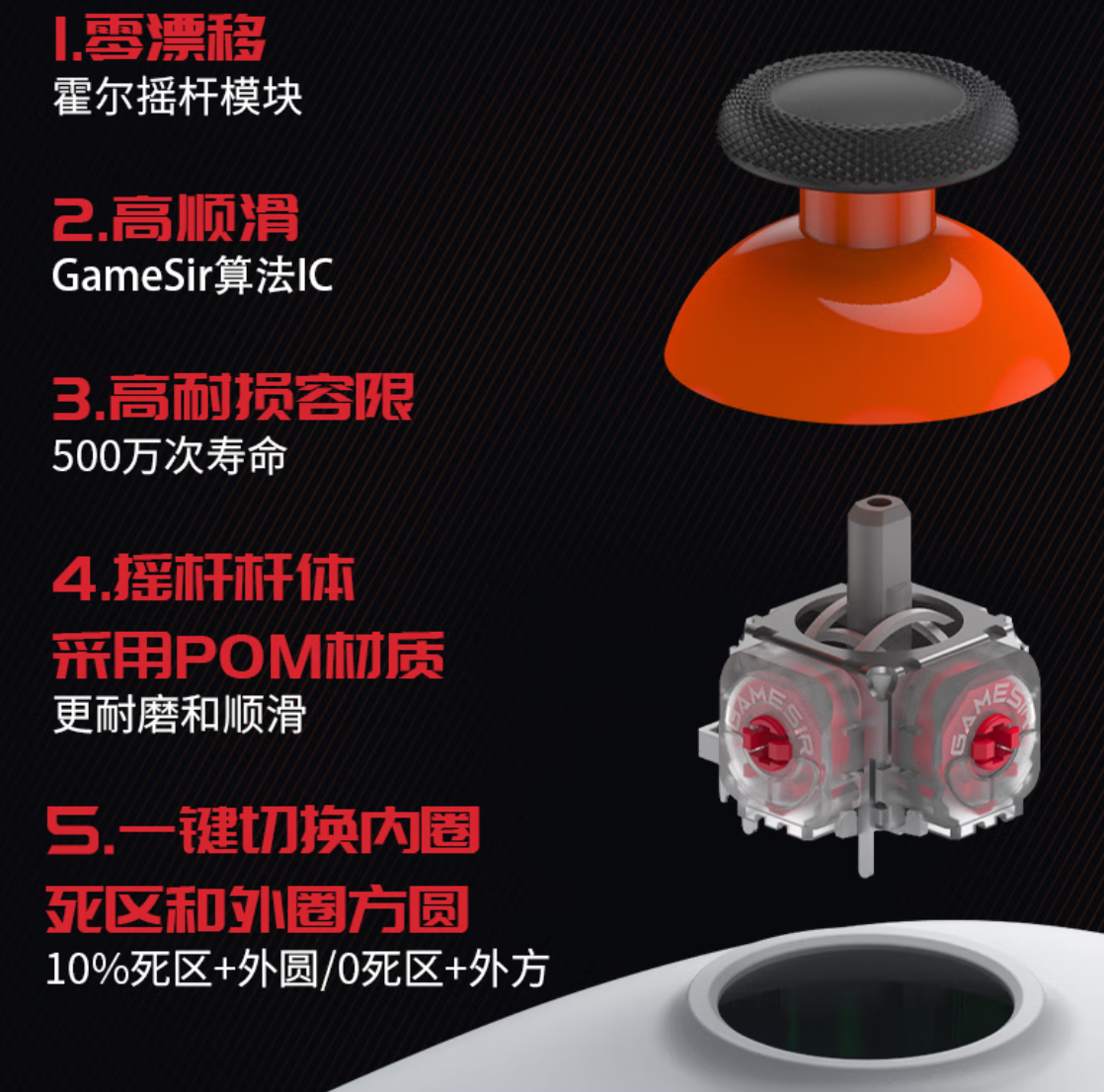 摇杆用的是霍尔摇杆 500W次寿命,搭配POM耐磨环,寿命长、不漂移,支持零死区设置(我其实不太care这事,但是我可以不用,你不能没有!)