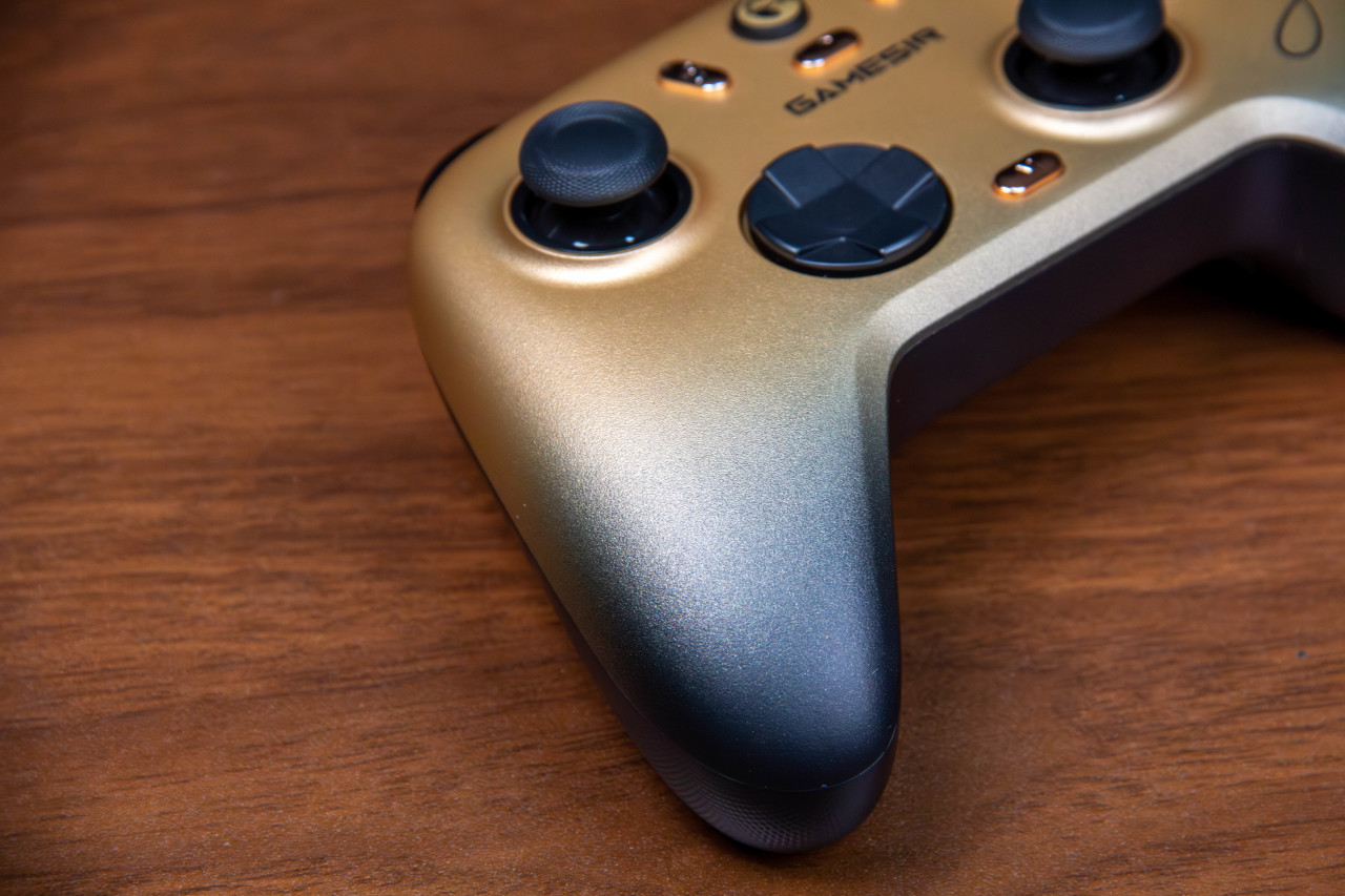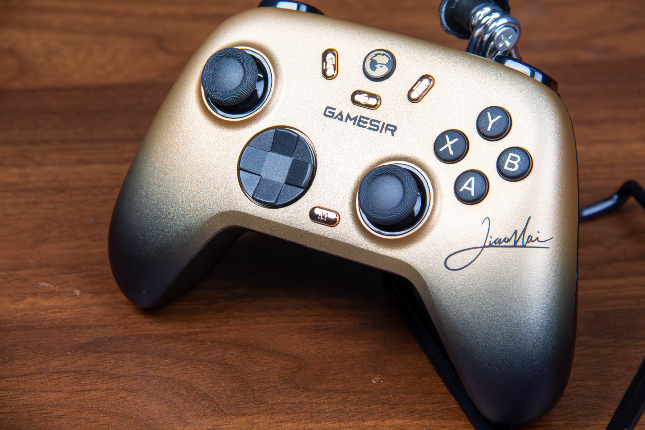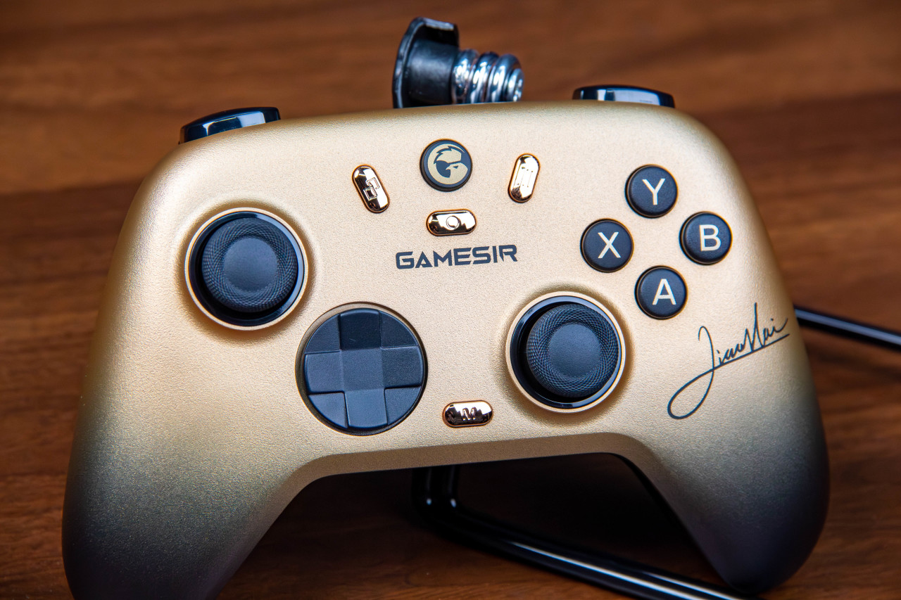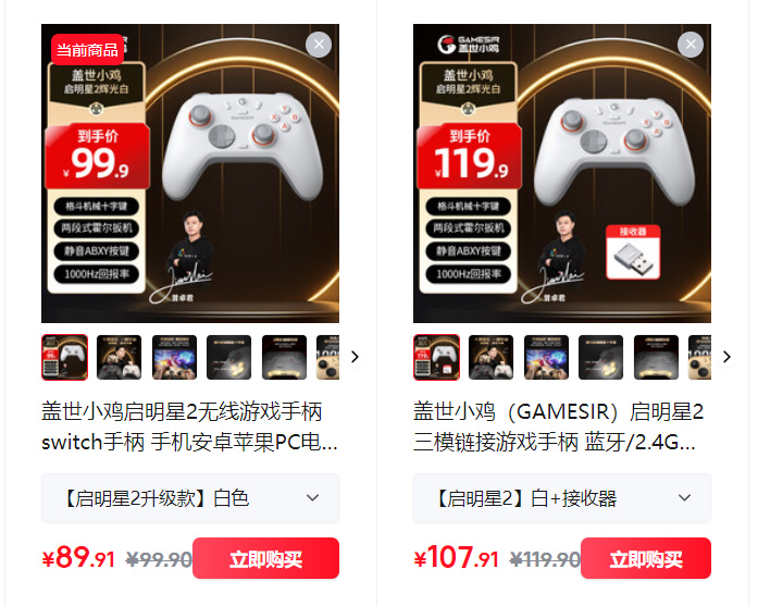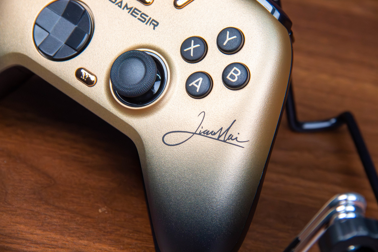 还有一个“小孩”联名冠军款,作为国内格斗第一人,“小孩”战绩辉煌,金色和黑色搭配的手柄更大气,更有氛围,再加上小孩的签名,让产品的档次又上了一个台阶