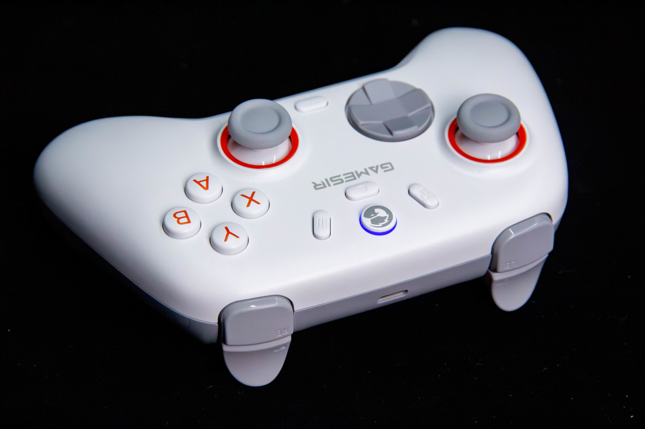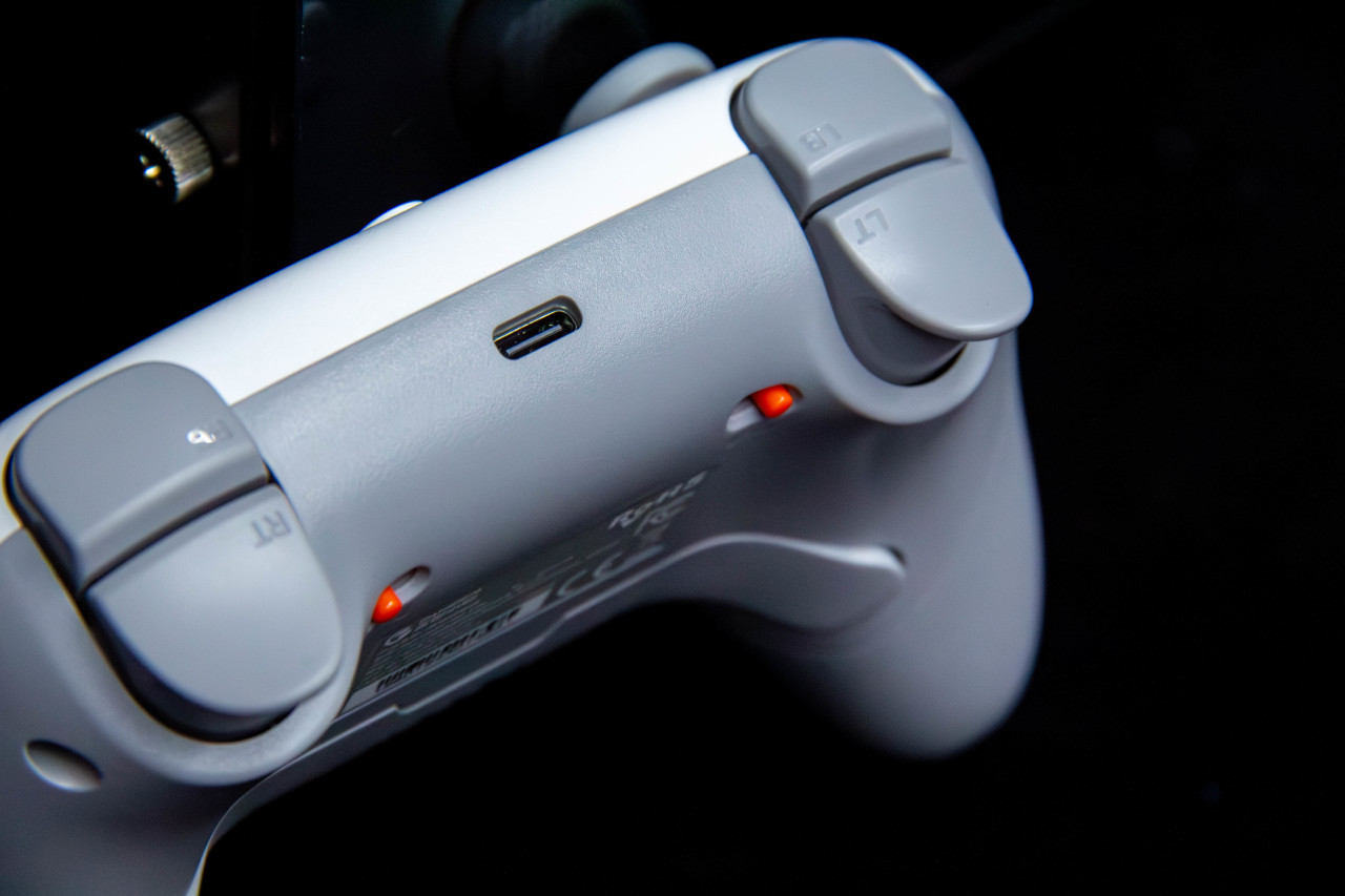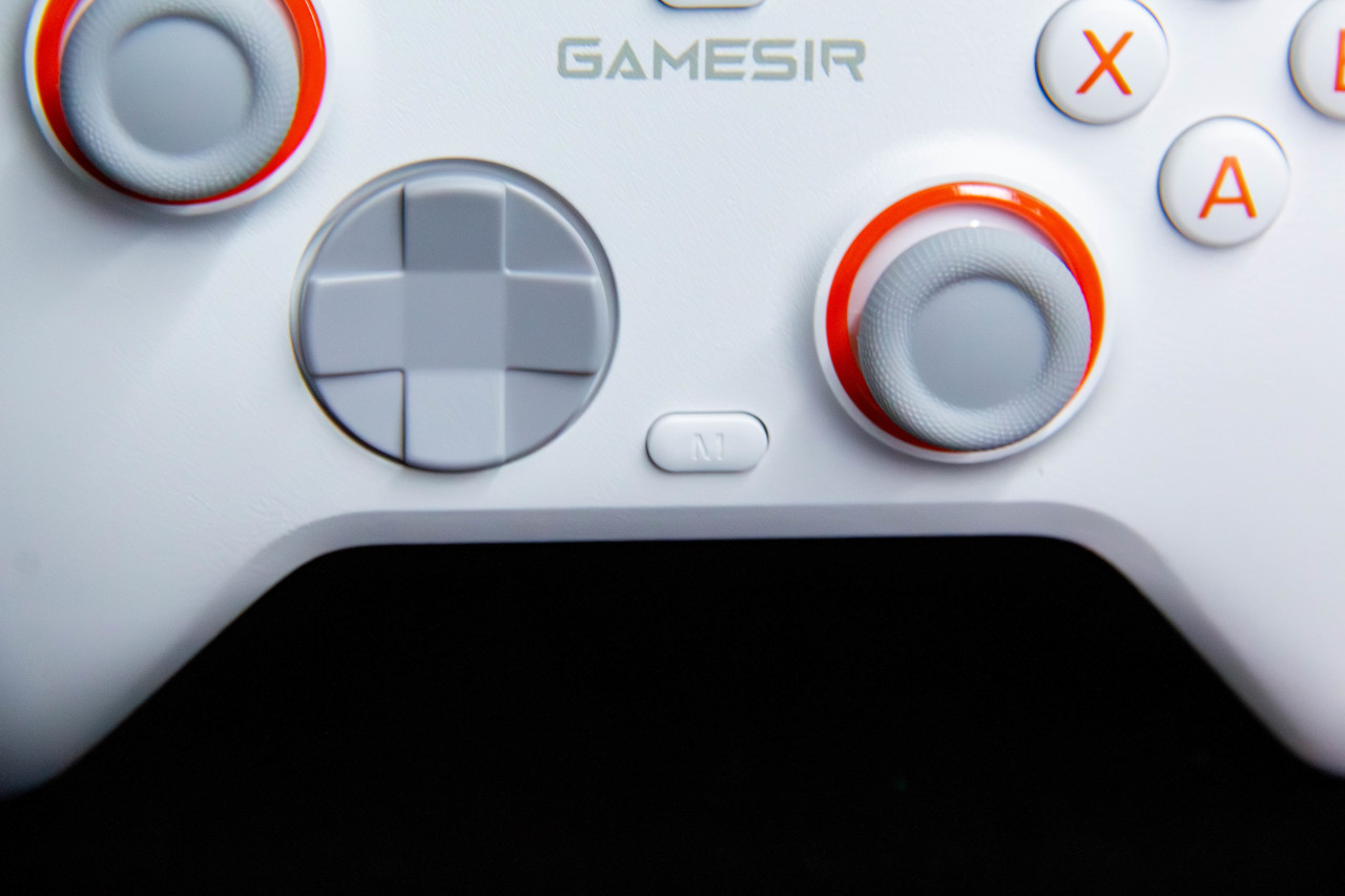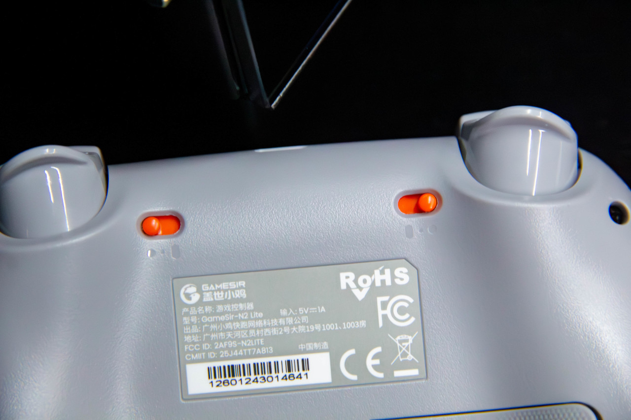 外观方面相当简洁。白色整体搭配橙色按键,挺有活力,加上灰色摇杆,整体配色挺舒服。