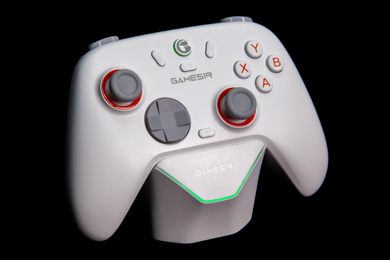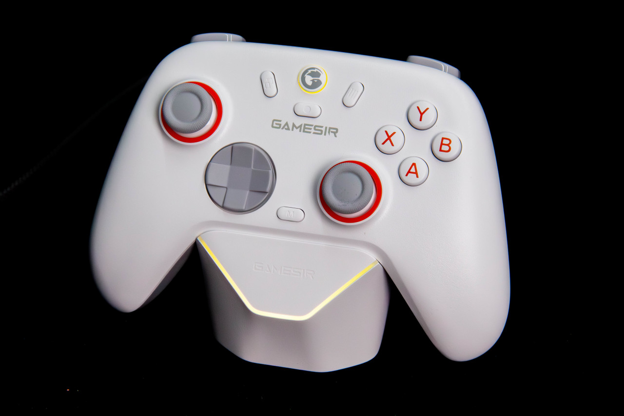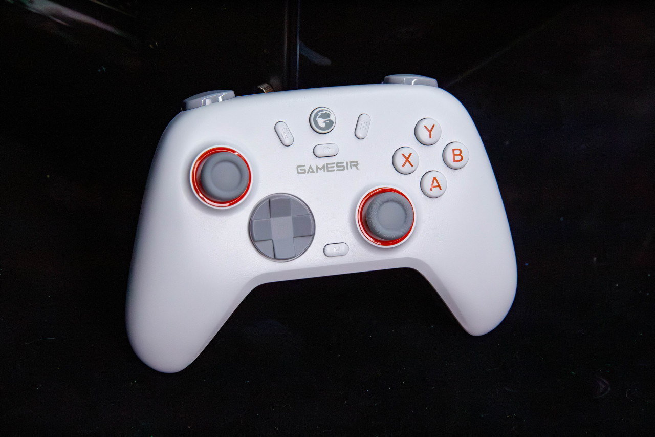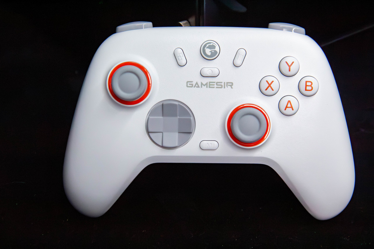外观方面相当简洁。白色整体搭配橙色按键,挺有活力,加上灰色摇杆,整体配色挺舒服。