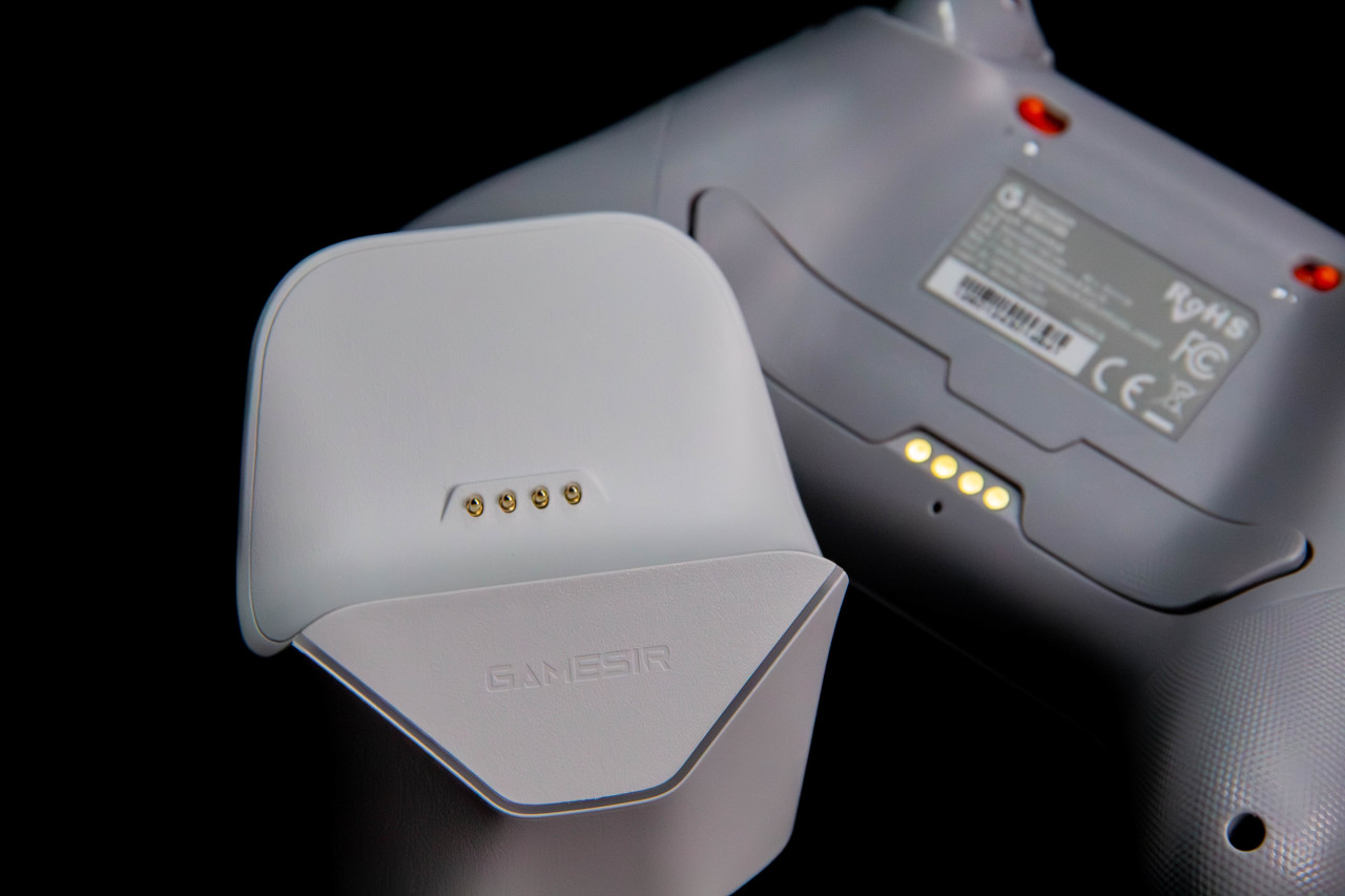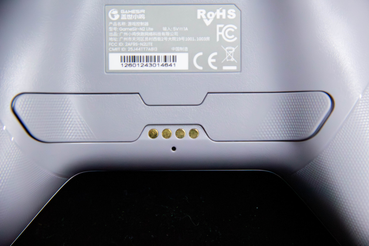 另外,这手柄居然还给了背键,这样就能多切一些功能,比如设成“聚气加血”。备件下面4个触点是充电用的,可以连接充电底座