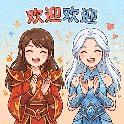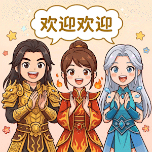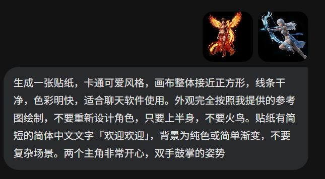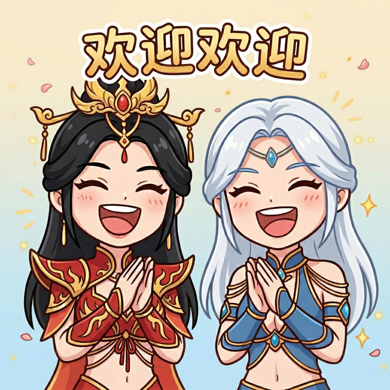提示詞:生成一張貼紙,卡通可愛風格,畫布整體接近正方形,線條幹淨,色彩明快,適合聊天軟件使用。外觀完全按照我提供的參考圖繪製,不要重新設計角色,只要上半身,不要火鳥。貼紙有簡短的簡體中文文字「歡迎歡迎」,背景爲純色或簡單漸變,不要複雜場景。兩個主角非常開心,雙手鼓掌的姿勢。