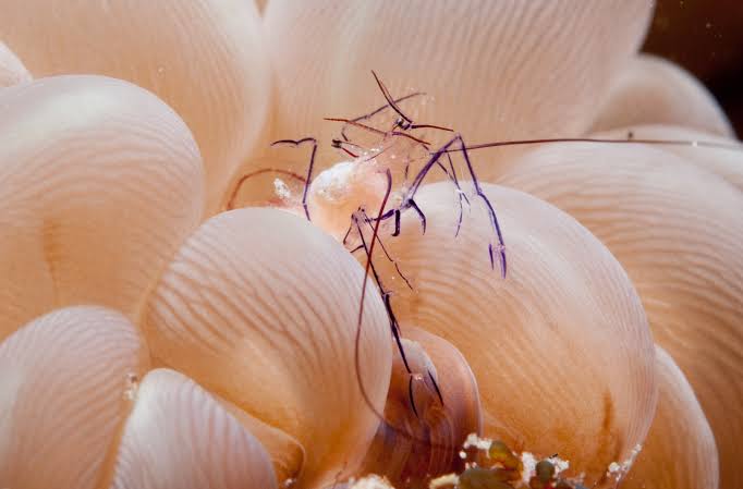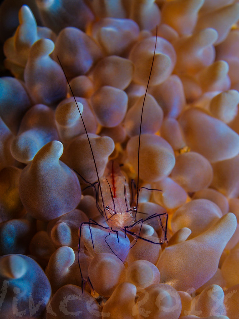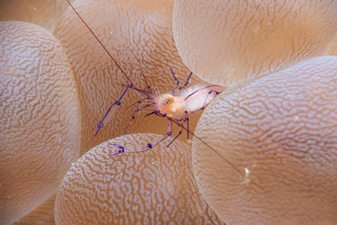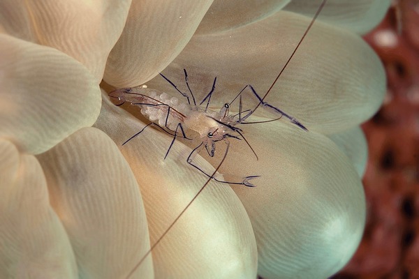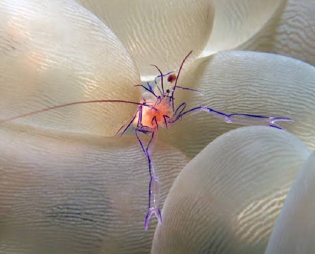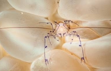 这是一种小型虾类,顾名思义,它们最常出现在气泡珊瑚内部,偶尔也会出现在海葵上。