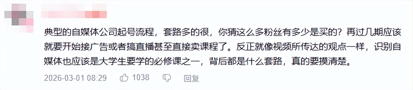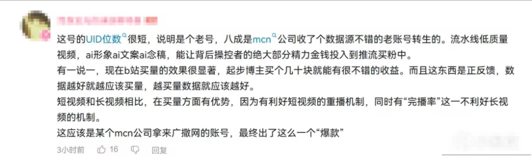 也有人指出具体问题,通过UID位数来判断该账号可能是数据不错的老账号转生,而非今年二月冒出来的新人。再根据其流水线化的AI形象、AI文案、AI念稿,以及看上去有些不正常的播放量数据,判断可能存在一个幕后推手。