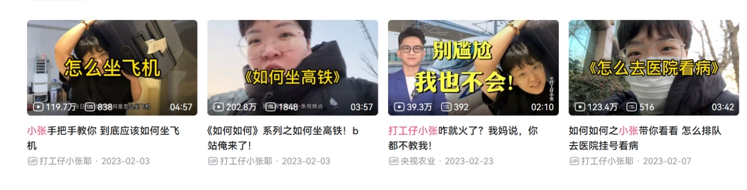 2023年初,UP主“打工仔小张耶”便因“如何乘坐飞机、高铁”“如何去医院看病”等视频爆火,甚至还被央视农业报道过。