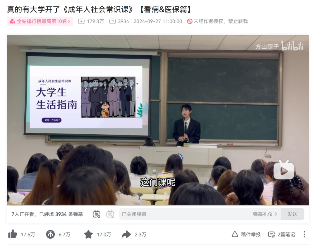 而2024年,南京传媒学院还开设了一门名为《大学生生活指南》的公选课,授课人同样在B站发布了完整的录像,包括看病、社保、租房、如何乘坐高铁飞机等诸多生活常识。值得一提的是,这部视频还曾登上过全站排行榜第十名,播放量也不俗。