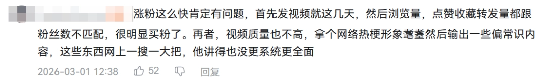 有人怀疑这个账号的爆火存在水分,并表示视频实际质量其实并不高,只不过是套用了耄耋这个热梗形象,然后把各种常识总结到了一起,再披上一层光鲜亮丽的剪辑手法外衣而已。