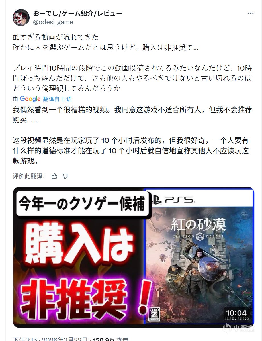近日,海外博主晒出《红色沙漠》游戏测评视频封面,吐槽,这种才玩了十个小时的游戏的人,有什么资格去对这个游戏盖棺定论,直言这个游戏不适合其他人呢?尽管他也清楚不可能一个游戏适合所有人,但直接说某个游戏不适合所有人,有点夸张了。