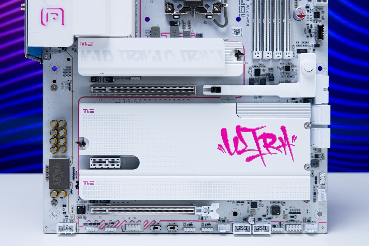 七彩虹iGame Z890 ULTRA-S W V20的M.2散热马甲均支持快拆,正面5个M.2槽位还是挺少见的,其分别支持PCIe 5.0 x4、PCIe 4.0 x4、PCIe 4.0 x4、PCIe 4.0 x4、PCIe 4.0 x4协议,其中一、二槽位走的是CPU通道,其他走的是芯片组通道,正常用户拓展非常够用了。