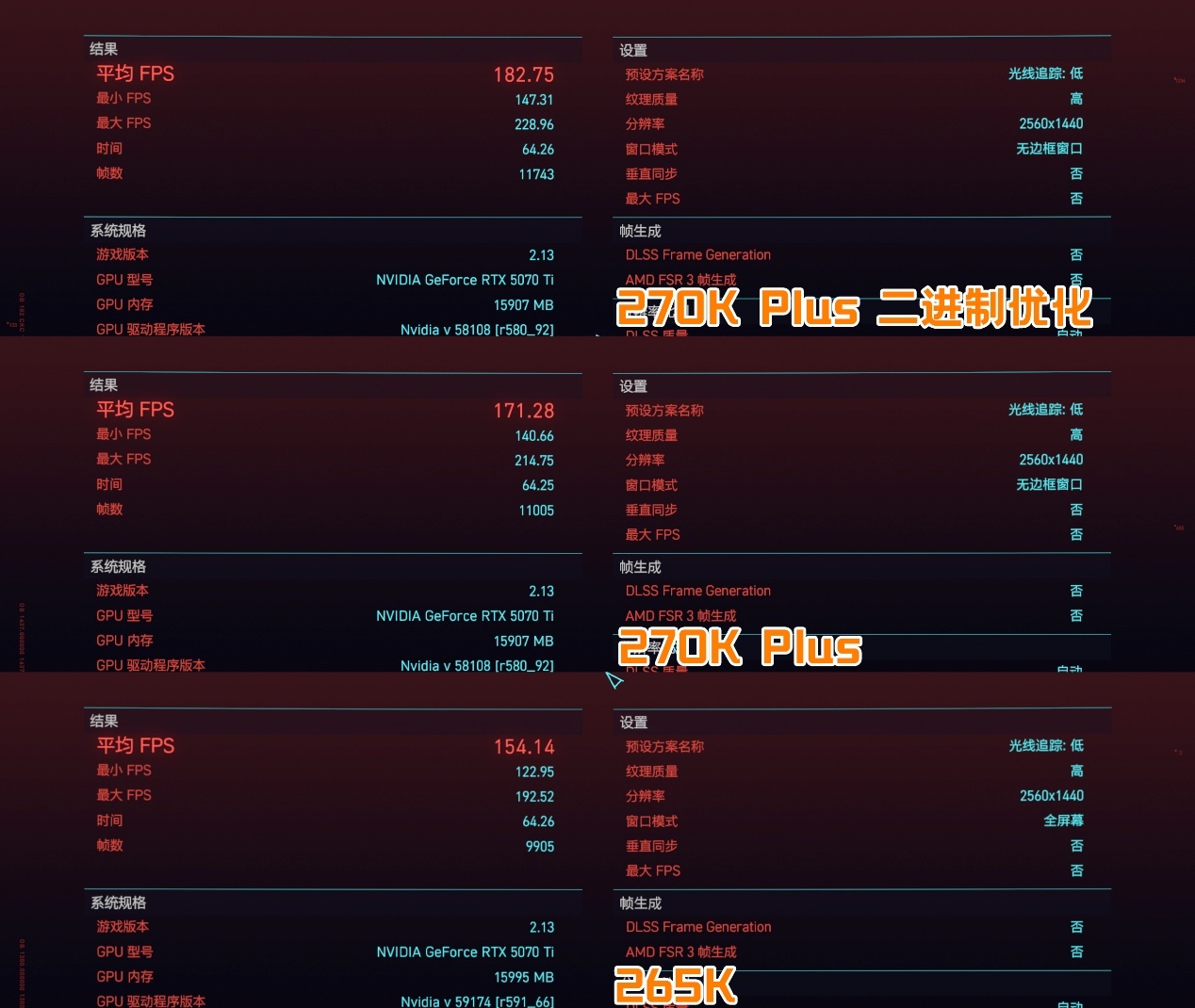 支持APO的《赛博朋克:2077》测试中,差距就明显了,2K分辨率默认光线追踪:低,默认270K Plus+5070Ti帧率可以跑到171,相比265K+5070Ti多出了17帧,最小帧率也提升了18,提升幅度约12%,而开启英特尔二进制优化技术(IBOT)后,270K Plus+5070Ti平均帧率来到了182,最小帧率147,优化提升约6%。