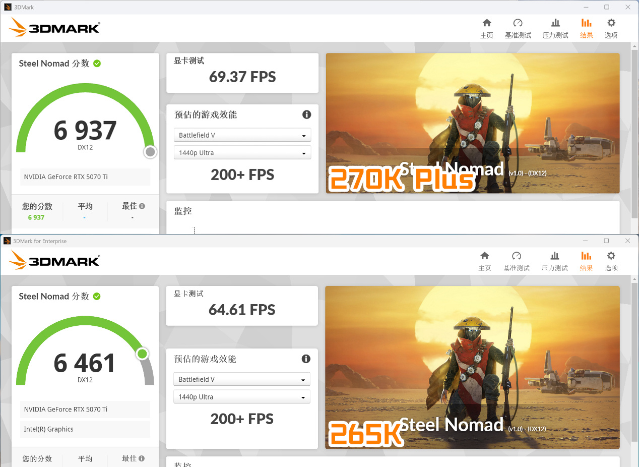 3DMARK Steel Nomad测试中,270K Plus+5070Ti综合得分6937,265K+5070Ti综合得分6461,Steel Nomad主要考验非光追渲染能力,显卡负载较高,而实际两套配置差距在7%左右。