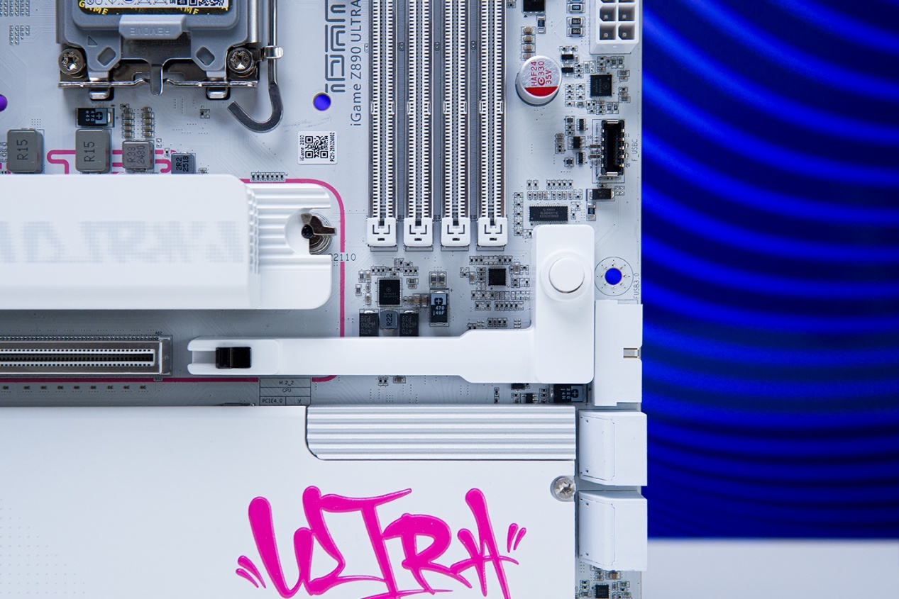 内存方面,七彩虹iGame Z890 ULTRA-S W V20单槽可支持到9600(OC)MT.s,四条容量可支持到256GB,内存槽位一侧可以看到EZ数位纠错灯,装机测试时可以根据数位显示快速定位问题。