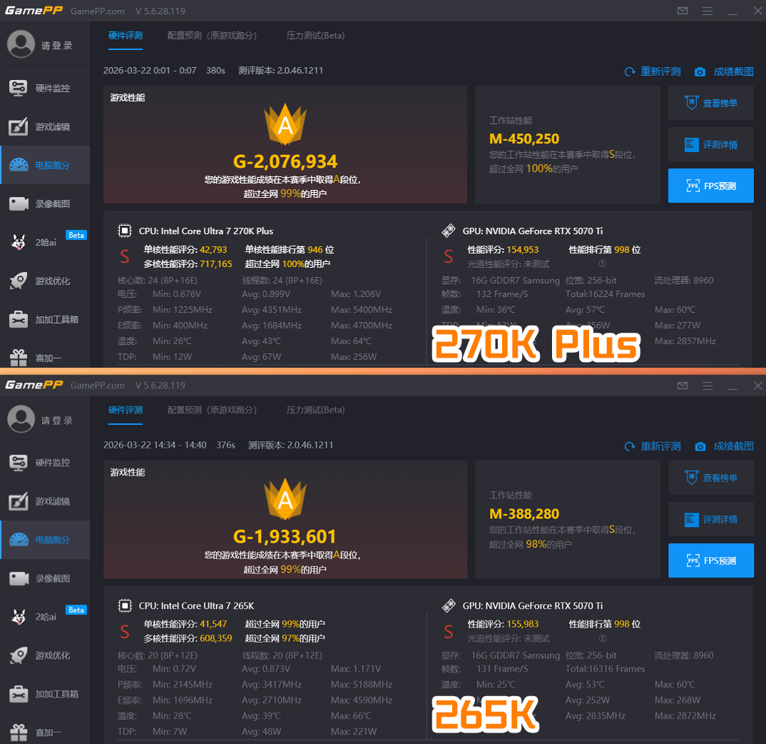 使用游戏加加进行综合测试,270K Plus+5070Ti游戏性能得分2076934,工作站性能得分450250,265K+5070Ti游戏性能得分1933601,工作站性能得分388280,两者差距分别为7%、15%,单看CPU得分情况,270K Plus相比265K单核性能高了2%,多核高了17%。