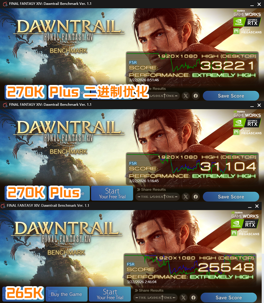 《最终幻想14》测试中,默认1080P分辨率,270K Plus+5070Ti比265K+5070Ti得分多出来21%,开启英特尔二进制优化技术(IBOT)后,270K Plus+5070Ti得分还能再提升6.8%。