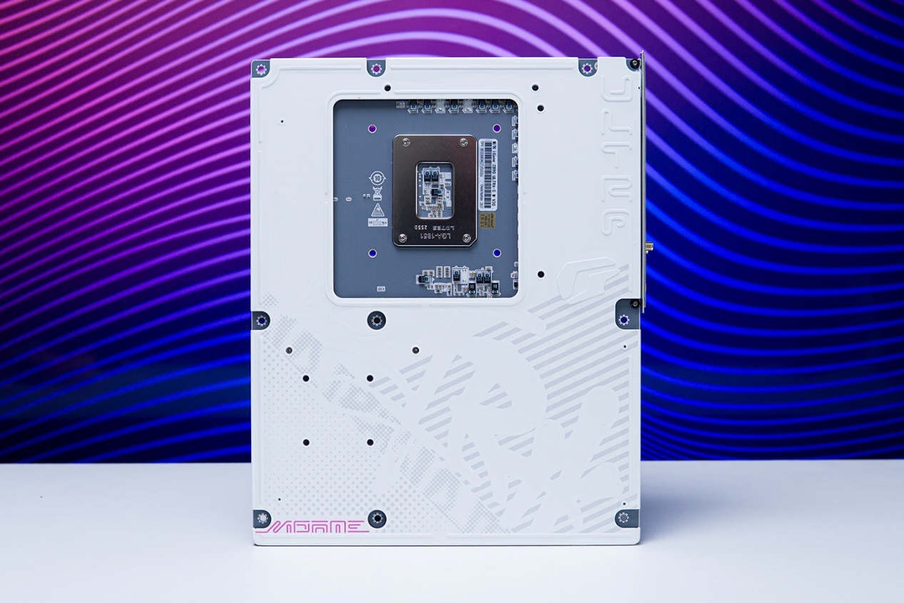 除了正面有大面积散热马甲外,七彩虹iGame Z890 ULTRA-S W V20的背面也有一整块加强背板,背部马甲不止可以保护针脚,提升颜值,也能有效散热。