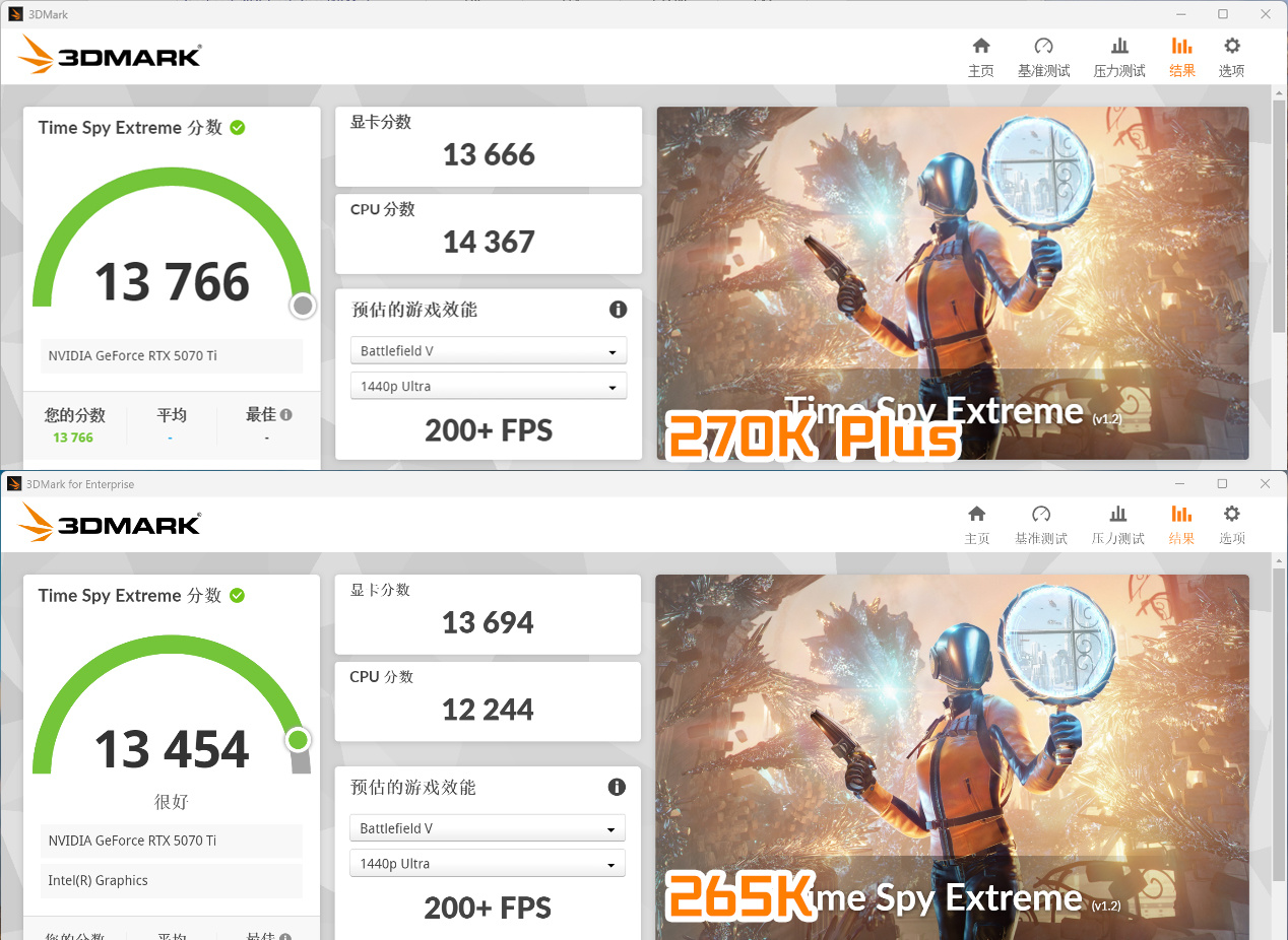 3DMARK Time Spy Extreme主要测试光栅化图形性能,270K Plus+5070Ti综合得分13766,265K+5070Ti综合得分13454,差异为2%,仔细看两套配置的显卡得分非常接近,而CPU得分,270K Plus比265K高出17%,说明显卡瓶颈影响较大。