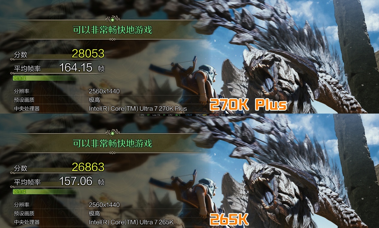 另一款去年的热门游戏《怪物猎人:荒野》,同样2K分辨率下,预设画质极高,270K Plus+5070Ti平均帧率164.15,265K+5070Ti平均帧率157.06,7帧差距也是平平无奇。