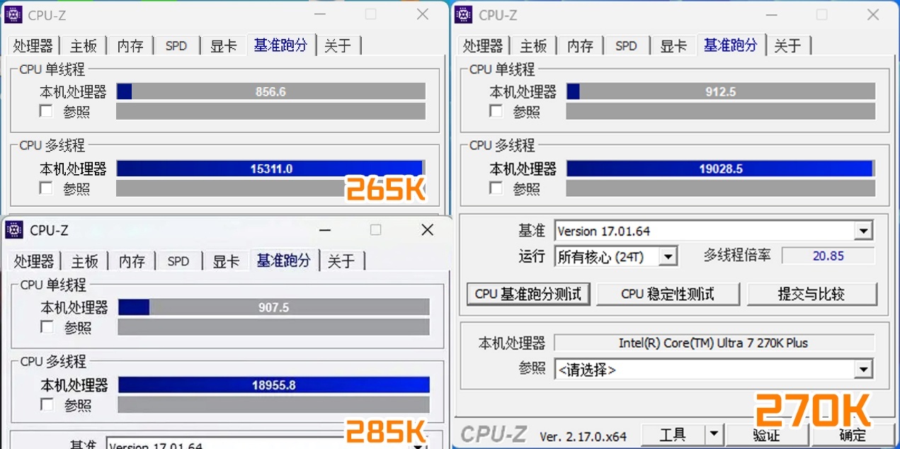 CPU Z跑分测试中,270K Plus单核得分915,多核得分19028,相比265K的856、15311均有明显提升,尤其是多核,新增了4个核心后性能直接提升27%左右!而相比285K,270K Plus单核多核均高出了一丢丢。