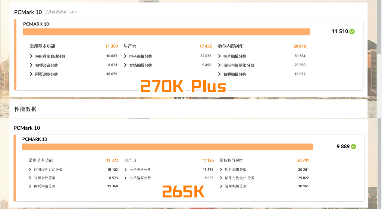 首先PCMark10跑分测试中,270K Plus+5070Ti综合得分11510,基本功能得分11399,生产力得分17435,数位内容创作得分20816,265K+5070Ti综合得分9889,基本功能得分11372,生产力得分11126,数位内容创作得分20741,270K Plus在应用程序启动、网页浏览、电子表格这三项有大幅度明显优势。
