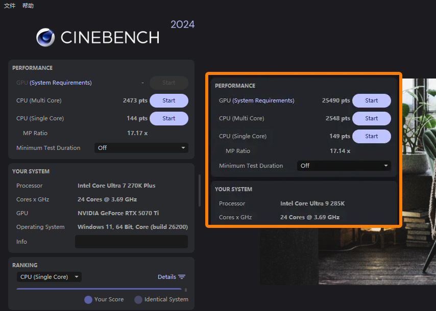 使用Cinebench 2024进行测试,270K Plus多核得分2473pts,单核得分144pts,多核得分比285K稍高,单核和285K稍低,考虑到测试误差可以认为两者跑分没有差异。