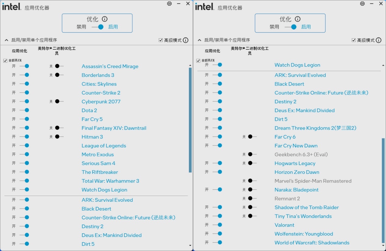 目前英特尔应用优化器APO支持30+游戏/软件优化,其中英特尔二进制优化技术(IBOT)支持13款游戏/软件,就内容方面不算多,还是要期待下后续的更新。