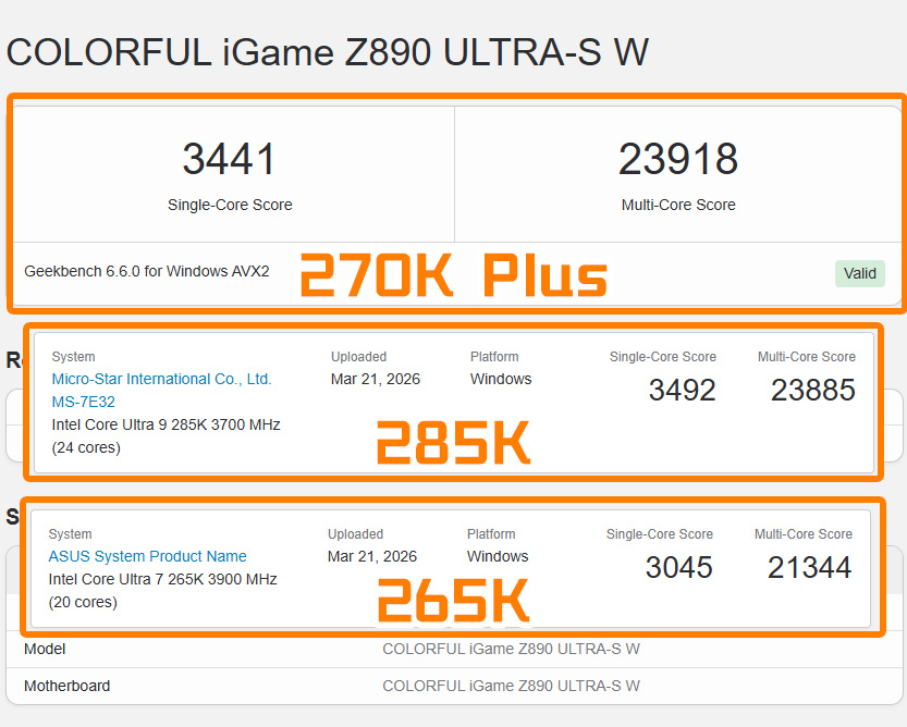 GeekBench6跑分测试中,270K Plus单核得分3441,多核得分23918,参考285K的在线结果,结论同样是,两者性能几乎一致,对标265K的话,270K Plus单核得分高出13%,多核得分高出12%。