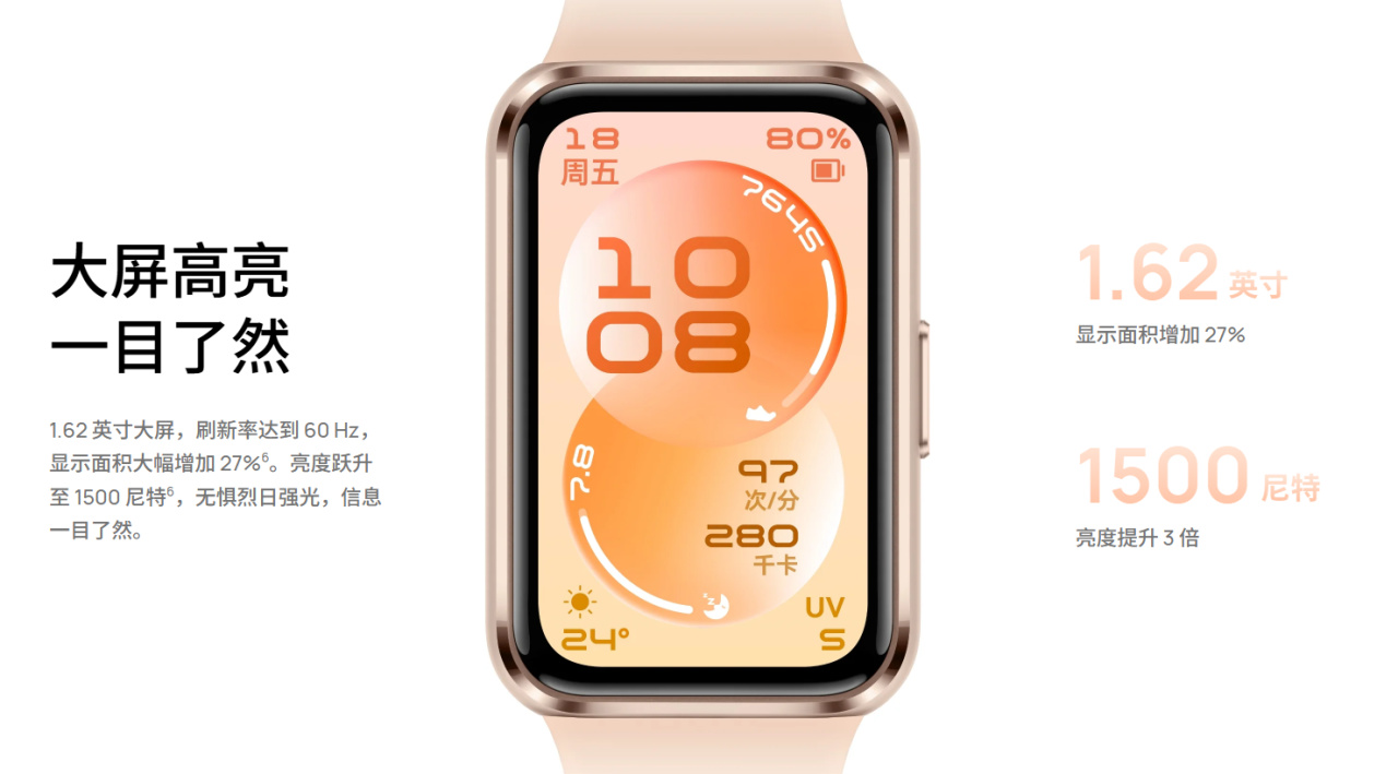 采用了 1.62 英寸 AMOLED 屏,分辨率 286×482 像素,347PPI,最高可达 1500 尼特,正面几乎四等边,升级到了60Hz 刷新率!!!