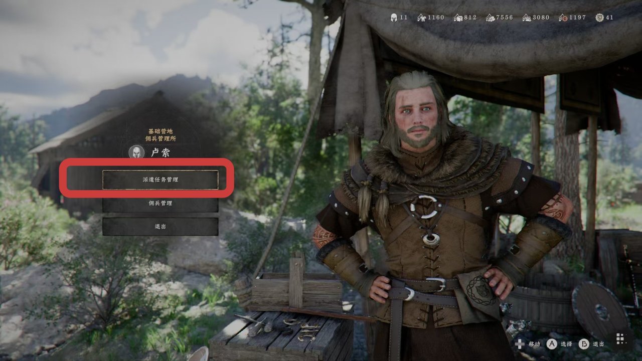 回到營地,跟管理傭兵的盧索對話,選擇“派遣任務管理”