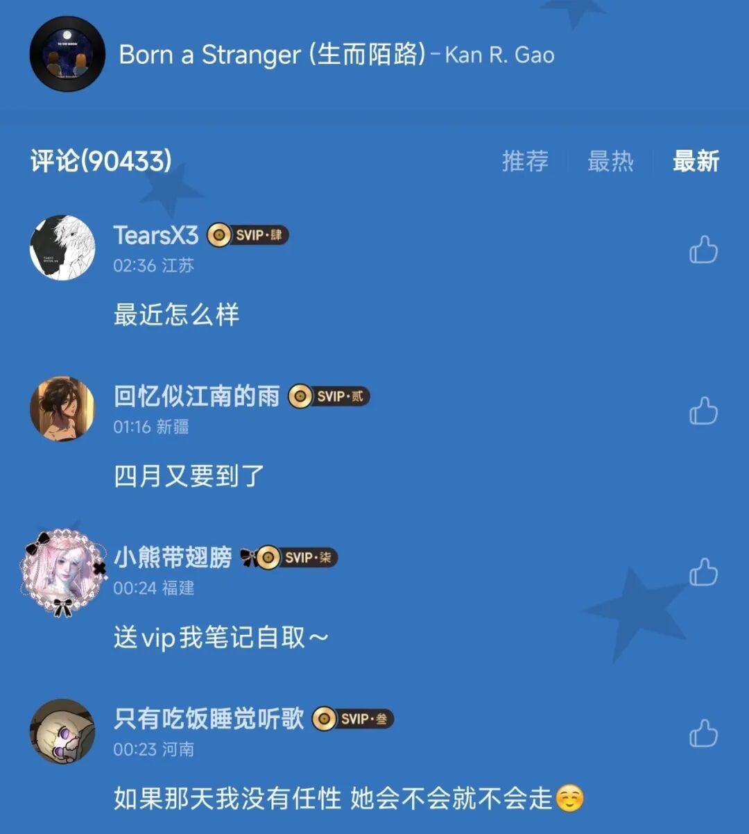 其中最著名,或者说臭名昭著的一位,是网易云用户“牯岭街少男”。他会在自己迪到的几乎每一首歌留下评论,而且内容莫名其妙,矫揉造作,和音乐本身毫无关联,甚至标点符号都用的乱七八糟。比如“我们躺在同一张床上,可心却隔,的好远”“怎么又来看我,是恨我还,是怨我”之类的玩意。