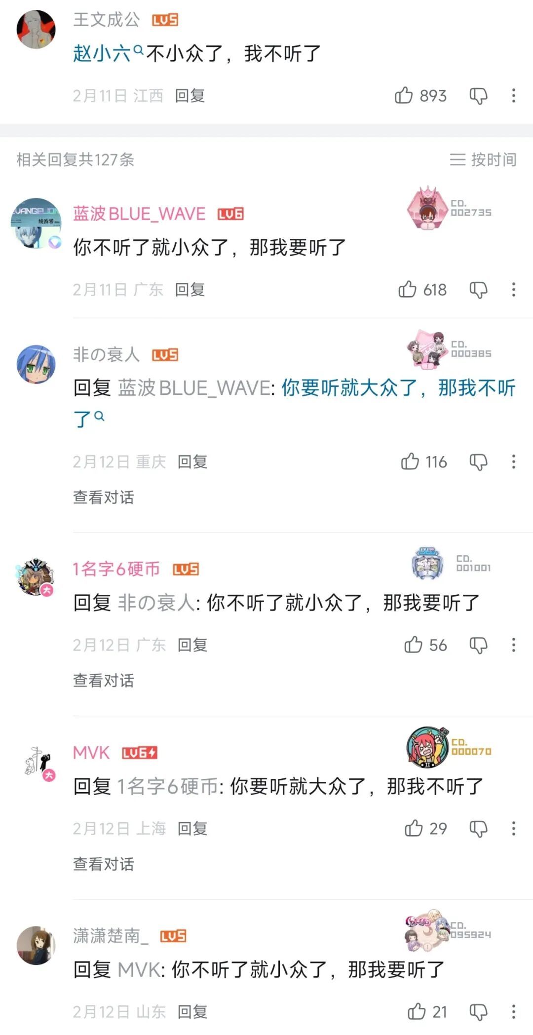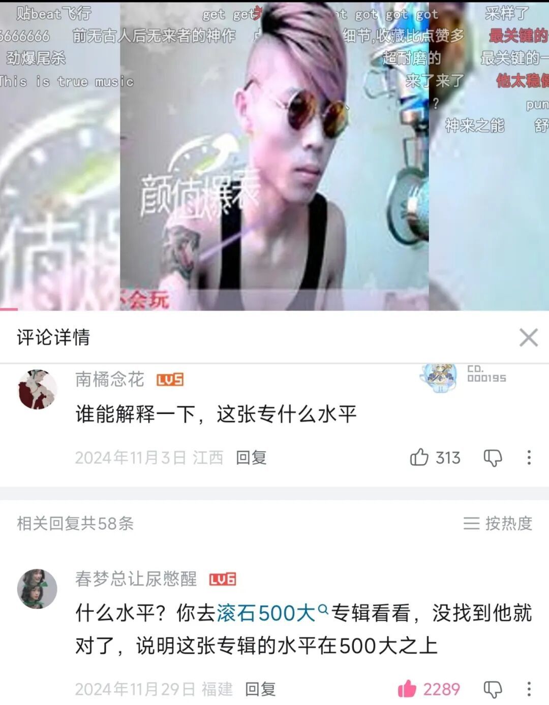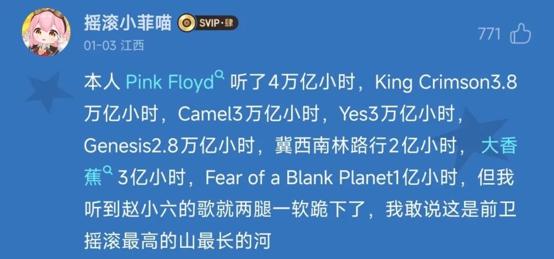 迪哥们除了堆砌术语,也常常为哪一种音乐类型更高级更小众争论不休。你发emo文案大概率没人理你,但如果你发“现在的音乐类型越来越枯燥了”“我觉得越洋飞机和loveless还不如酸性摇滚”,评论区就很可能被新老迪哥们的斗争淹没。