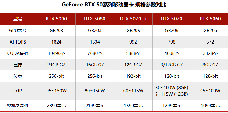 除显存外,RTX 50 系列移动显卡各型号在核心算力与硬件配置上也形成了梯度划分。AI TOPS方面,RTX 5090 达到 1824,是系列中算力最高的型号,RTX 5080 为 1334,RTX 5070 Ti 为 992,新版与旧版 RTX 5070 为 798,RTX 5060 为 572,呈现出明显的旗舰到中端的算力递减。CUDA 核心数方面,RTX 5090 以 10496 个领先,RTX 5080、RTX 5070 Ti、RTX 5070、RTX 5060 依次为 7680 个、5888 个、4608 个、3328 个,硬件配置的梯度与产品定价相匹配,整机参考价从 RTX 5060 的 1099 美元到 RTX 5090 的 2899 美元不等,RTX 5070 移动版整机参考价为 1299 美元。