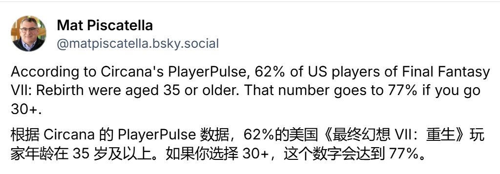 Circana分析師Mat Piscatella分享了該公司PlayerPulse數據中的玩家人口統計信息,他表示:“根據Circana的PlayerPulse數據,62%的美國《最終幻想7:重生》玩家年齡在35歲或以上。如果放寬到30歲及以上,這個數字會達到77%。” 這些數字表明,玩家羣體主要由該系列的長期粉絲構成,而非新加入的玩家。