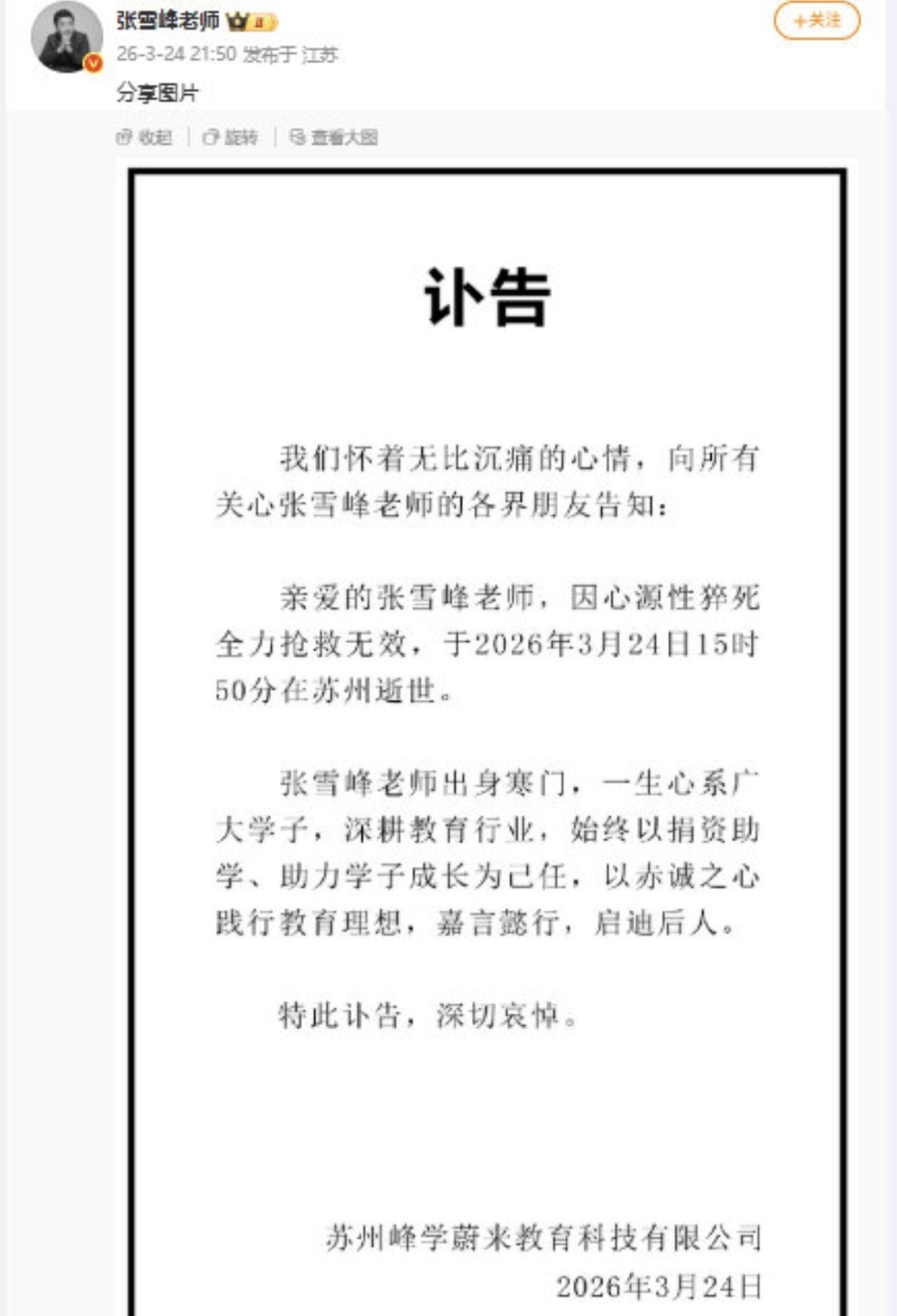 张雪峰老师于2026年3月24日15时50分在苏州因心源性猝死不幸逝世,终年41岁。他的公司苏州峰学蔚来教育科技有限公司当晚正式发布讣告:“我们怀着无比沉痛的心情,向所有关心张雪峰老师的各界朋友告知:亲爱的张雪峰老师,因心源性猝死全力抢救无效,于2026年3月24日15时50分在苏州逝世。”讣告还强调了他“出身寒门,一生心系广大学子,深耕教育行业,始终以捐资助学、助力学子成长为己任”的赤诚之心。