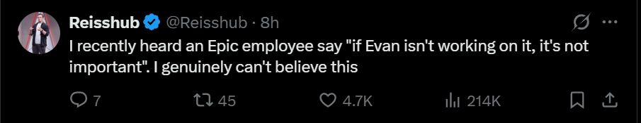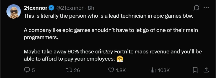顺便一提,这可是Epic Games的首席技术员啊。像Epic Games这样的公司不应该裁掉自己的核心程序员。或许应该把那些令人尴尬的《堡垒之夜》地图收入的90%都砍掉,这样你们就能付得起员工工资了。