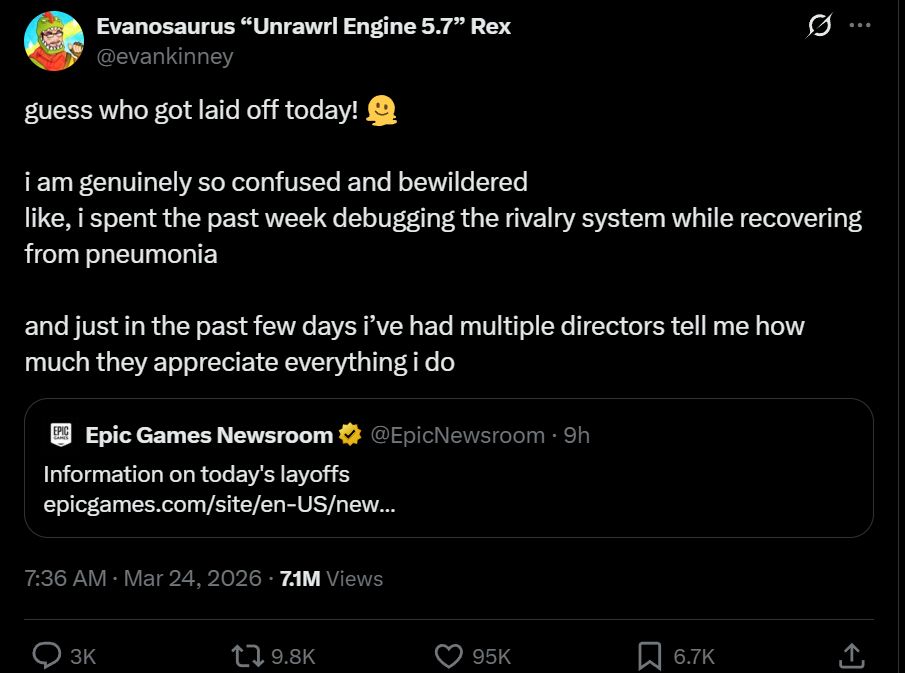 Today we’re laying off over 1000 Epic employees. I'm sorry we're here again. The downturn in Fortnite engagement that started in 2025 means we're spending significantly more than we're making, and we have to make major cuts to keep the company funded. This layoff, together with over $500 million of identified cost savings in contracting, marketing, and closing some open roles puts us in a more stable place.ss