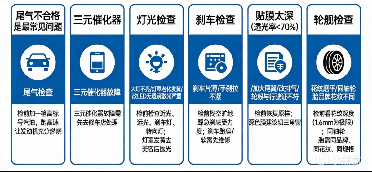 贴膜太深(透光率低于70%)、加了大尾翼、改了排气、轮毂尺寸和行驶证不符。检之前恢复原样。深色膜建议切个三角窗。