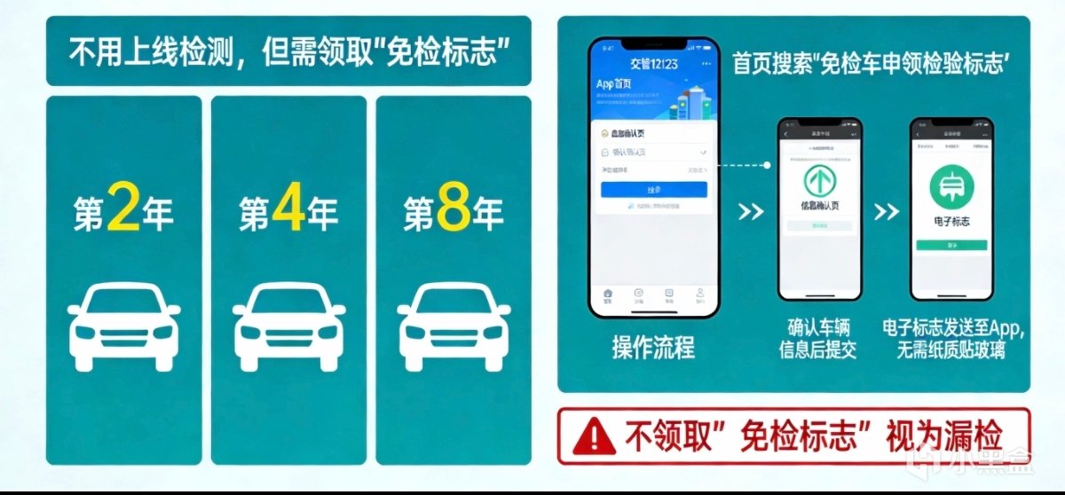 第2、4、8年的车,不用去检测站,但要领“免检标志”。在“交管12123”App上操作:首页搜“免检车申领检验标志”,确认信息,提交。电子标志就发到App里了,不需要纸质贴车玻璃上。千万别忘了,不领也算漏检。