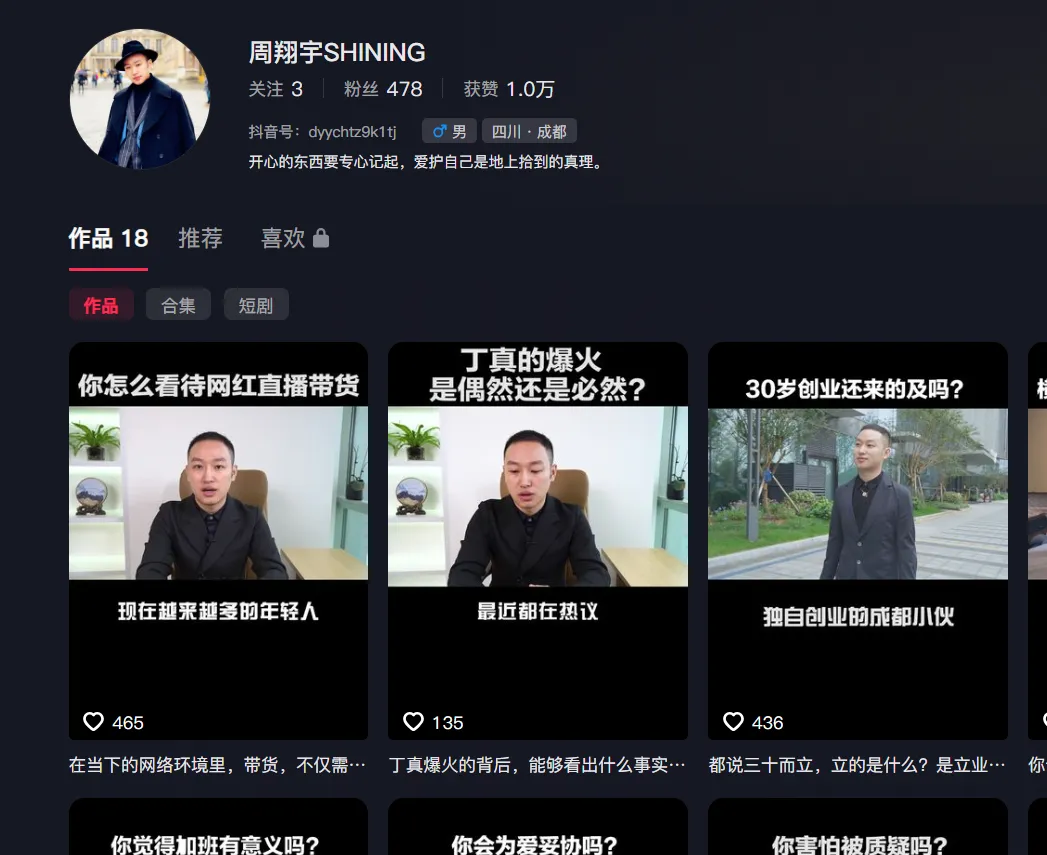 他也有抖音账号,账号内容都是与创业有关的,跟杨迪不同,他走上了创业之路。