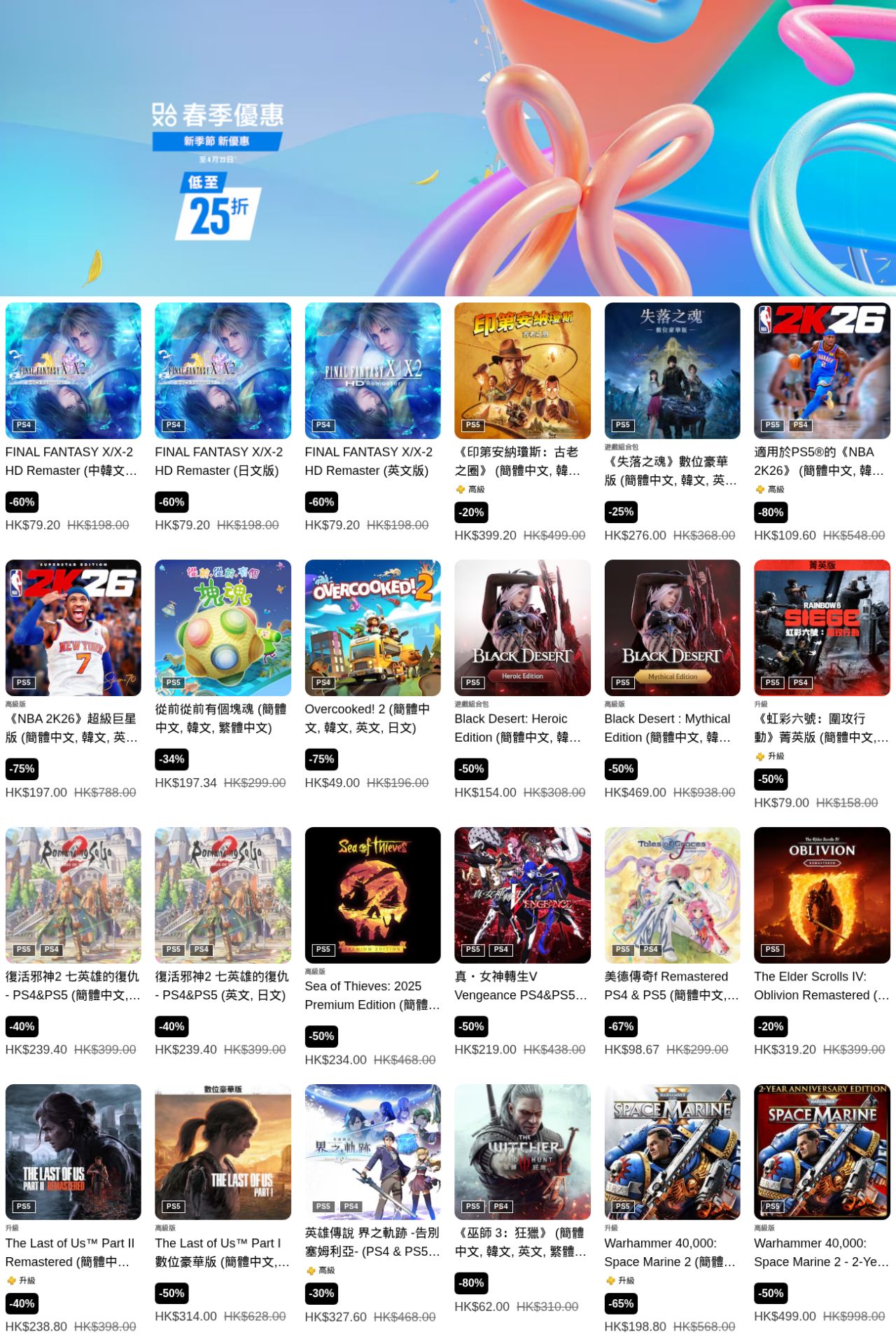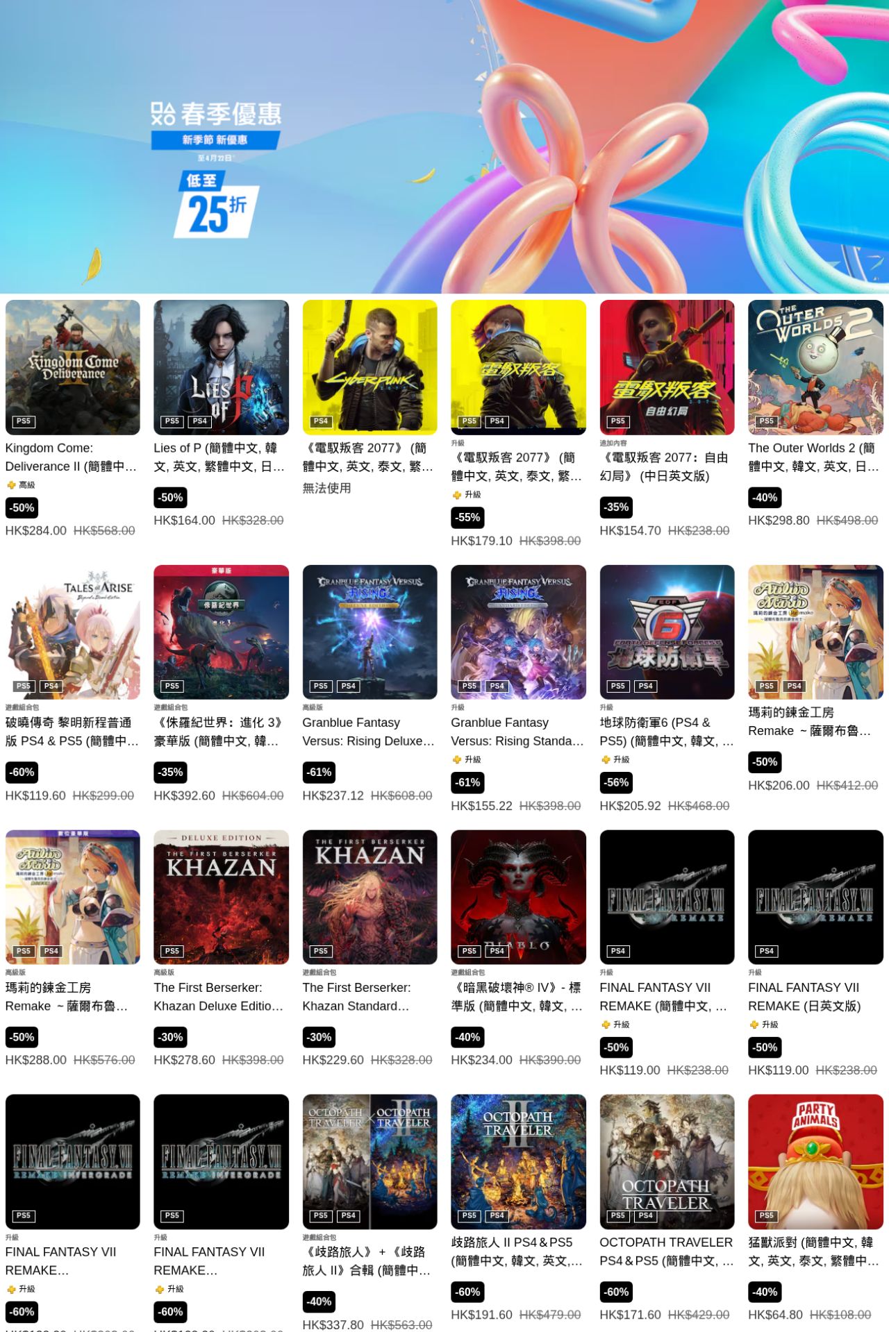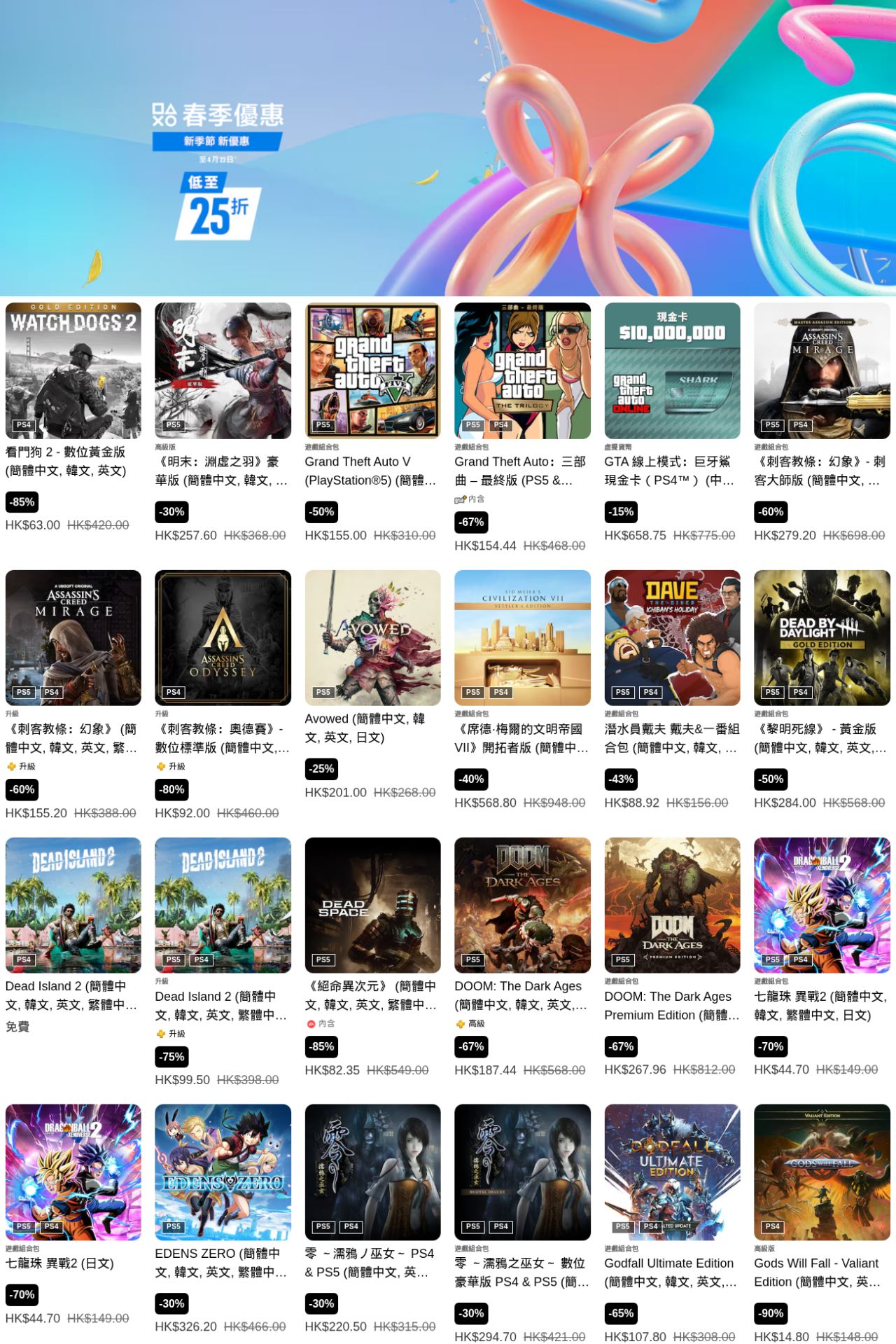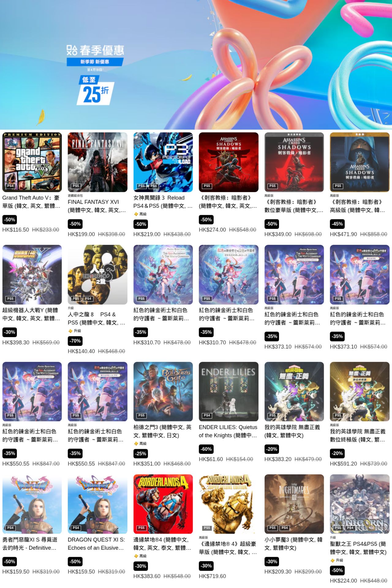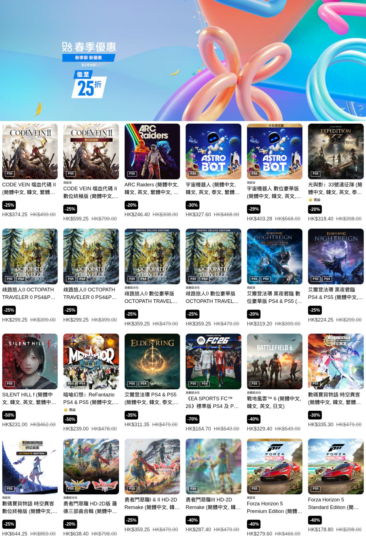 索尼PlayStation港服商店現已開啓“春季優惠”遊戲折扣,《光與影 33號遠征隊》、《暗喻幻想》、《艾爾登法環 黑夜君臨》、《地平線5》等多款遊戲參與其中,本次遊戲優惠活動截至4月22日(部分截至4月8日),有需要的朋友可以關注下。