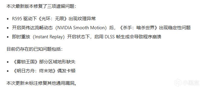 此次最新版本修复了三个剩余问题:R595 驱动程序下《光环:无限》的纹理损坏、启用 NVIDIA Smooth Motion 时《杀手:暗杀世界》的稳定性问题,以及在启用即时回放功能时启用 DLSS 帧生成功能导致的崩溃。