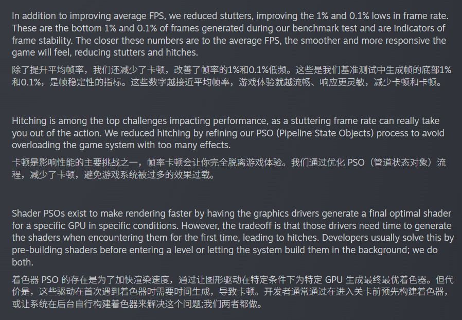 “我們的首要目標是在確保玩家能注意到我們實現的幀率改進,與不破壞其遊戲體驗之間取得平衡,”工作室寫道。他們在這方面的努力,使運行在從最低到推薦配置的各種硬件系統上的平均幀率提升了約20%。