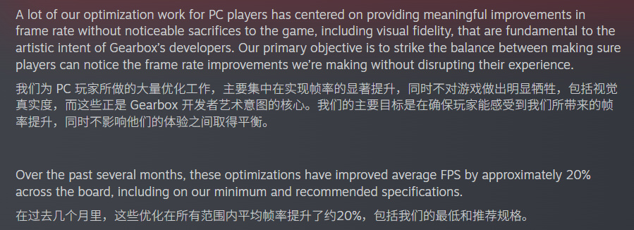 “我們爲團隊自遊戲發售以來在提升《無主之地4》PC性能方面所做的工作感到自豪,同時也認識到我們還有更多工作要做,”工作室寫道。“我們是長期投入的!”