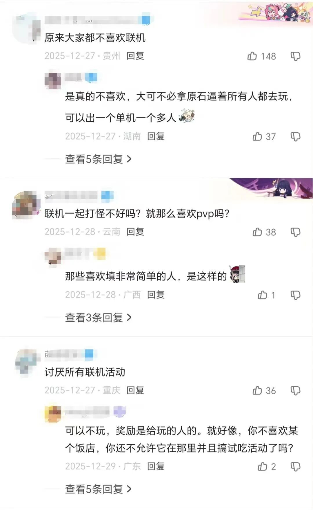 二游们也并非没有做尝试,比如《原神》就多次在小活动中增加了比较轻量的PVP元素,但即使是这样也还是刺激到了玩家们的“肠胃”。诚然,确实有部分玩家对上了脑电波,享受PVP的乐趣,但同时也有许多不容忽视的声音正在表达对PVP元素的厌恶。